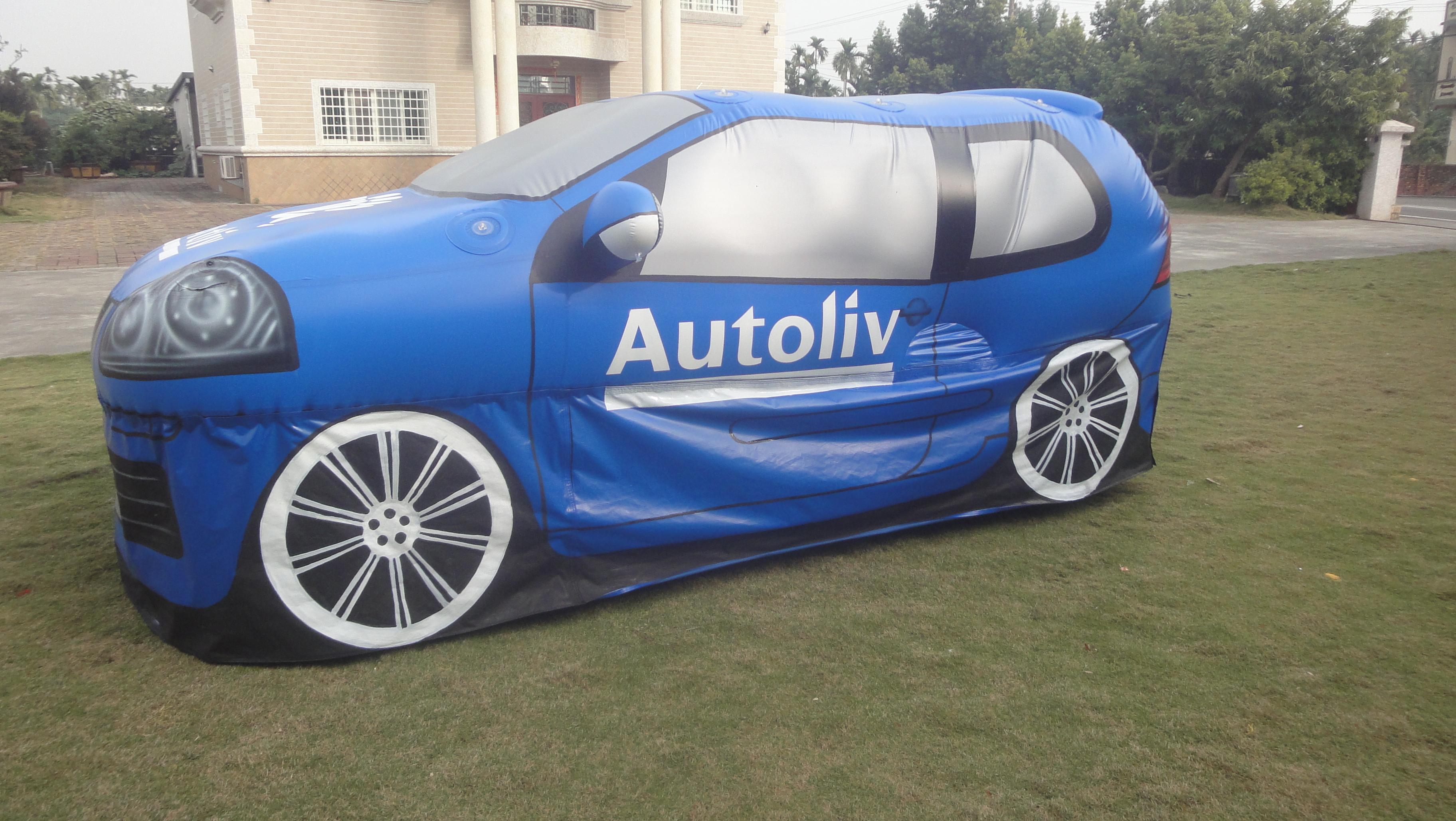 This is a repeat design for an established automotive Swedish client. A 3.7m long PVC version of the upper part of the VW Golf car is tied to a heavy duty 0.90mm PVC tarpaulin “rib”, which acts as a protective sledge so that the car can be towed behind a moving vehicle, thereby becoming an effective moving “target” in collision testing. The rib is covered by a nylon “skirt” to create the full visual effect of a VW Golf.