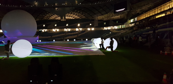 It was found on site that the LED lights within the spheres were not bright enough when within the stadium setting and viewed through the TV monitors, so our crew re-wired and added additional lighting units on site and the end result was excellent!!!