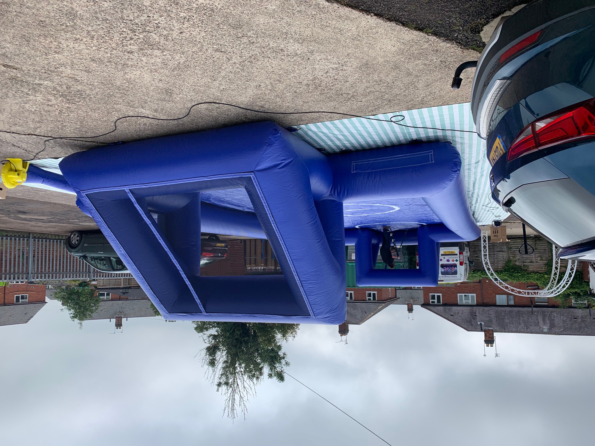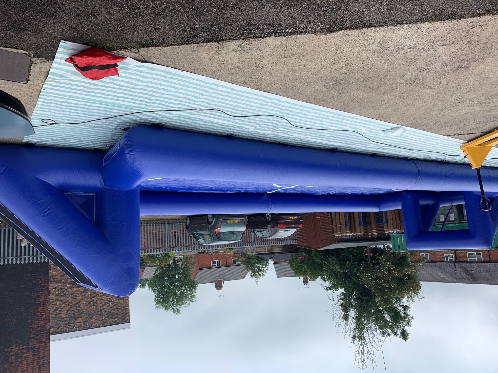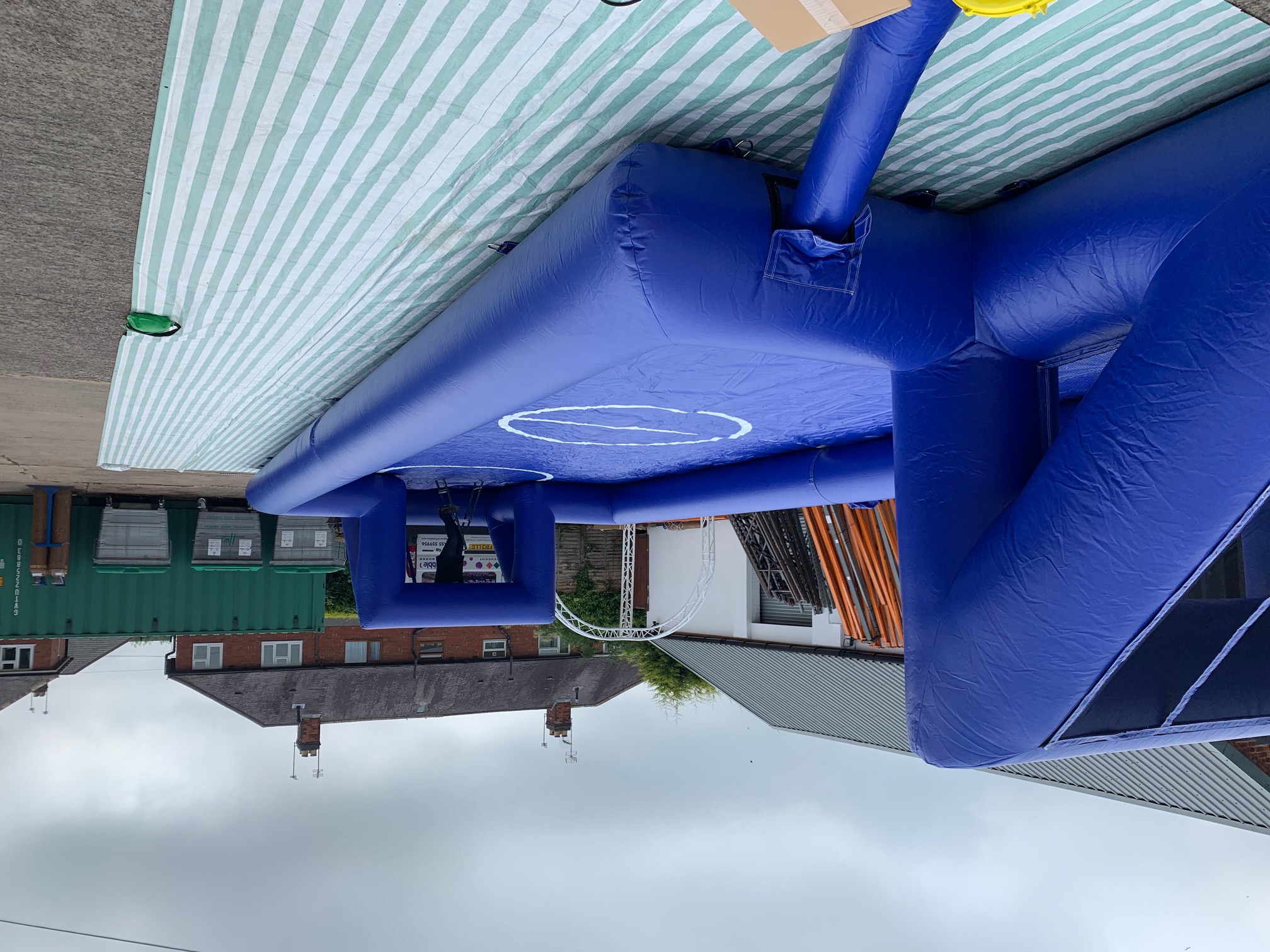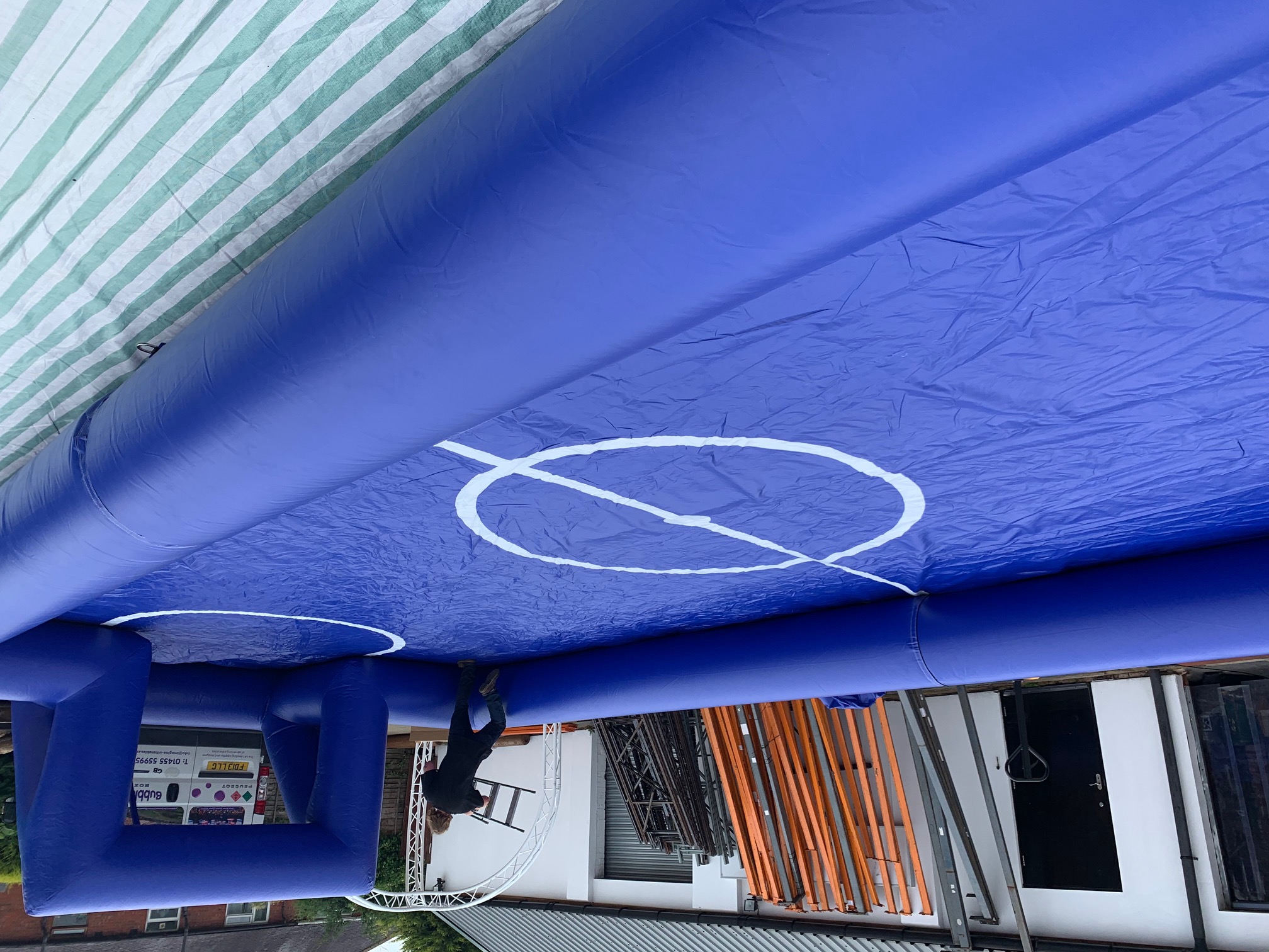 Categories: General Posted: Friday, 17 July 2020 Football pitch This is a 12m x 6m Slip N Slide football pitch. The base sheet is printed and is Velcro removable. The pitch itself is in 2 sections each with its own fan, to help with transport and lifting. Access for players is either via the gap in the 2 sections, or through the goals (the netting is also removable). Artwork can be applied on these products either as direct print onto the tubing, or on detachable banners. Production time for pitches this size is around 2 weeks. Send Enquiry