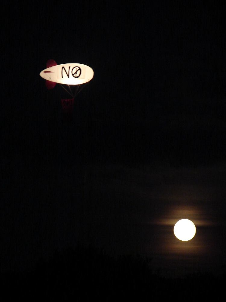 The Frack Free Fernhurst 'No Fracking' blimp showing the height of the drilling rig bordering the proposed site at night.