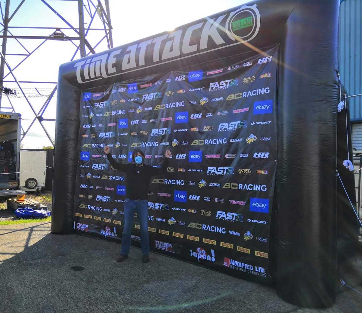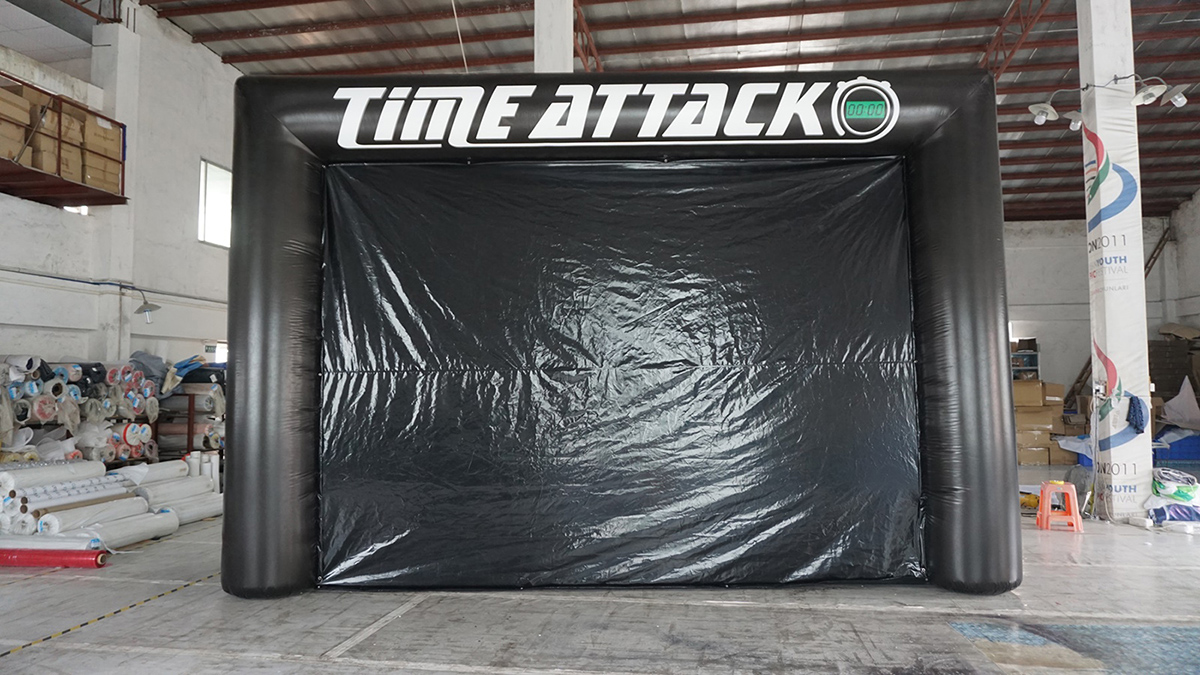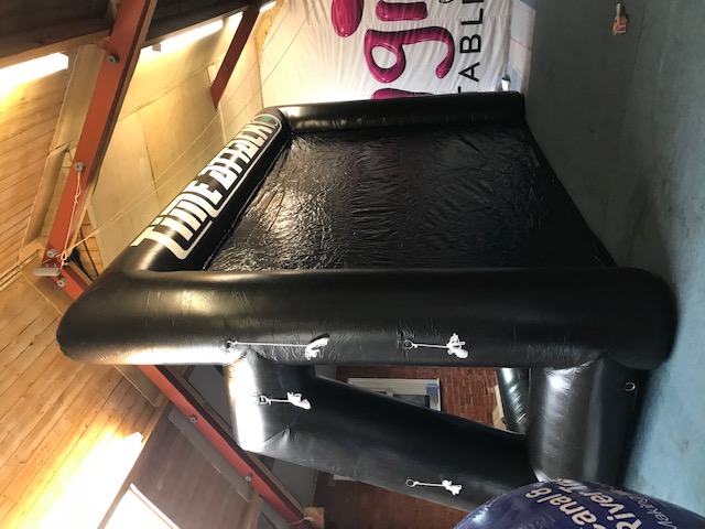 Our client wanted to upgrade their existing 10 year old nylon billboard with a wipeable version which can also serve as a podium backdrop for race winners. Champagne tends to get everywhere when you shake the bottle!! The 6m W x 4m H Cold Air Filled PVC tarpaulin billboard is a very durable all-weather option. The frame has eyelets for printed detachable banners to be tied on; however the plain black insert sheet allows you to use the inflatable as a podium backdrop at prize-giving.