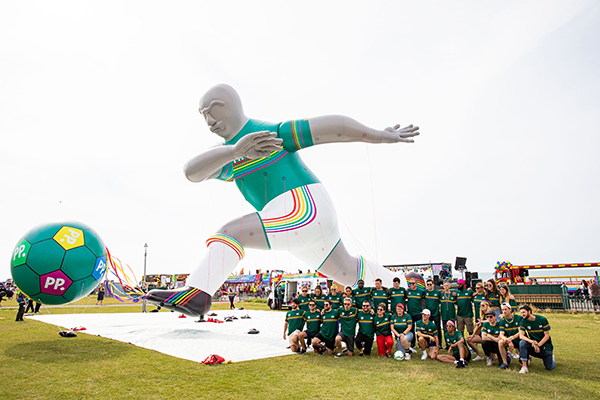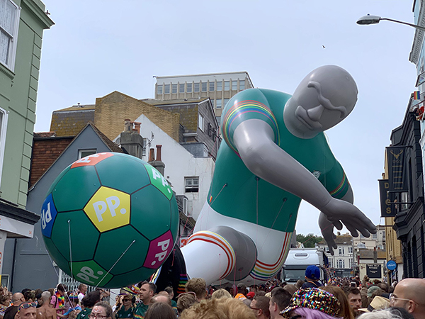Our most recent install was at Brighton Pride event last weekend where we installed a giant helium filled footballer character for Paddy Power which was connected with rainbow ribbons to an inflatable football style sphere to give the effect of the footballer kicking the ball.