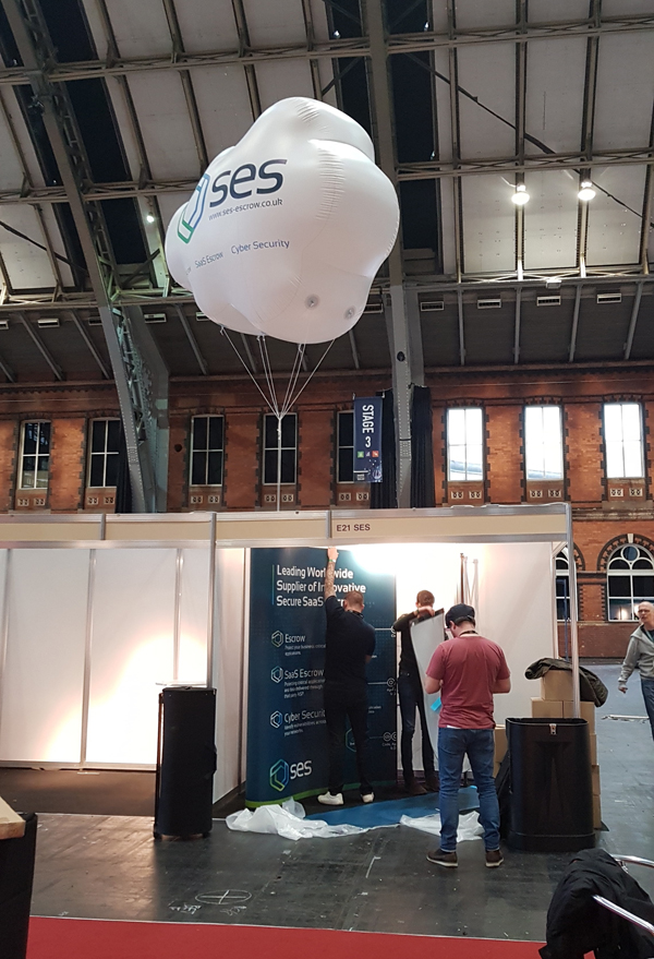 We made a 3m x 2.5m helium filled cloud for our new customer SES which was used to float above their stand for an exhibition in Manchester.