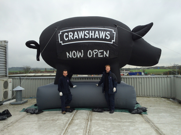 Categories: General Posted: Monday, 17 November 2014 Inflatable Roof Top Pig for Crawshaws Butchers! Another succesfull project/ installation by the team at Imagine. This project was turned around in just 2 weeks and was installed last Thursday by Joe and Julian. The customer was very happy with this eye catchging marketing inflatable which will attract attention for the client Crawshaws Butchers in Rotherham! Send Enquiry
