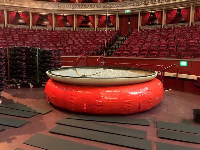 The Royal Albert Hall asked us to produce a giant doughnut ring that could take a 200kgs payload. We have used a marine grade 0.90mm PVC tarpaulin which is often used in the manufacture of dinghies. Here it is in taking centre-stage at the Royal Albert Hall, it is used to inspect their rigging and to perform maintenance.