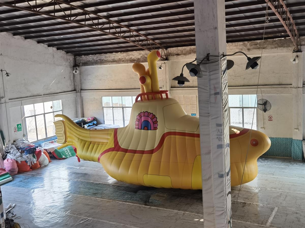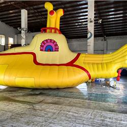 This 10m yellow submarine will sit on the water at the Isle of Wight festival. Made of thick PVC, it is a complex design of internal beams with a flat base.Ideal for ponds, lakes for short term use/promos, but not open, choppy water. If you are interested in inflatables for sea, please ask - these will be in a very thick 0.6mm PVC tarpaulin.