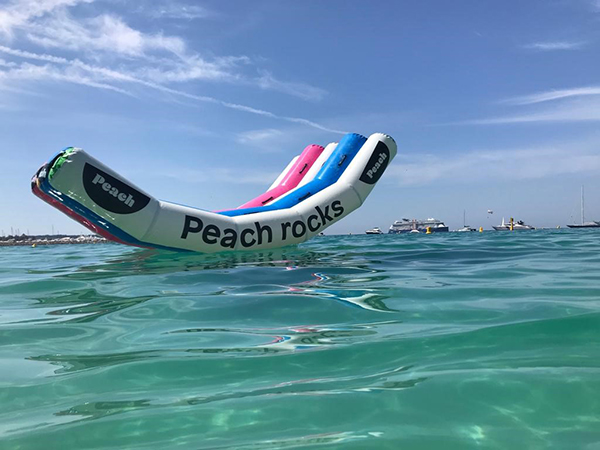Our client Peach Video came back to us again this year for the Cannes Lions Festival, for a water-based see-saw fully branded which they wanted to place near the beach at La Croisette harbour, right in the middle of the action. The below 4m long x 2m wide “Maxi Water Totter” is a ride-on inflatable which rocks forwards and backwards and is suitable for calm open water. It is heavy duty 0.60mm marine tarpaulin and will take both adults and children.