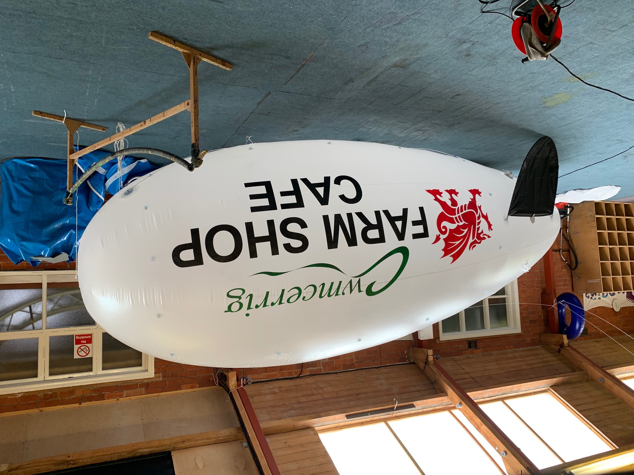 CWM Farm Shop in Wales came to us to get their old blimp replaced. The advantage of our outdoor blimps is the removable rigid fins (as opposed to inflatable fins, which are integral to the main blimp so if damaged affect the integrity of the whole structure). We offer our 20ft long outdoor blimps as a rental or purchase package including helium and an operator to train you.