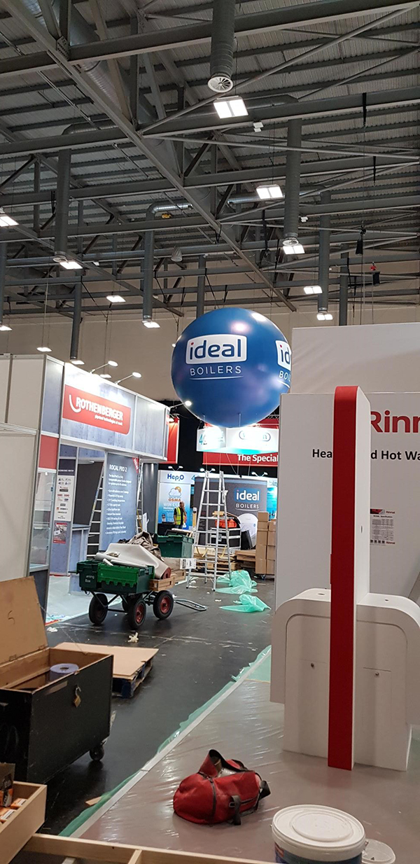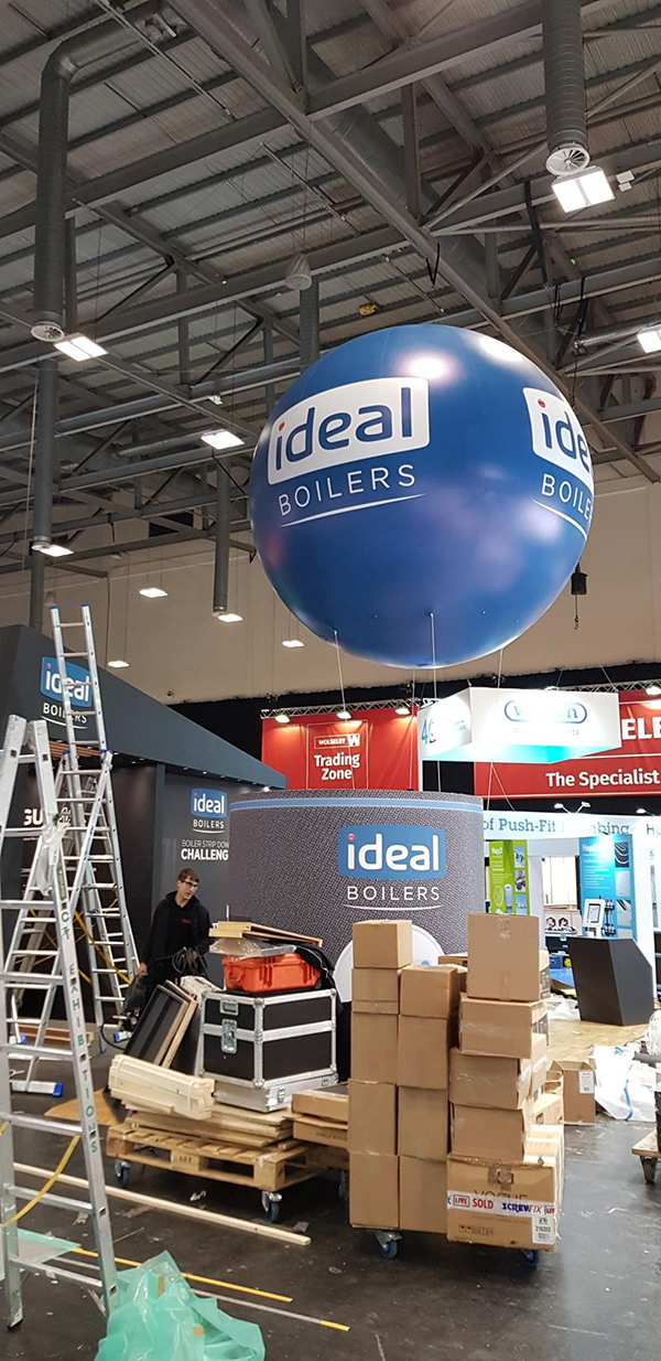 Our latest installation was at the Ricoh arena in Coventry yesterday where we installed a 4.5m sphere with helium. The sphere floated above the stand and was anchored onto a basket that the customer made to look like a hot air balloon.