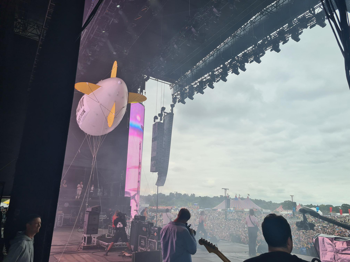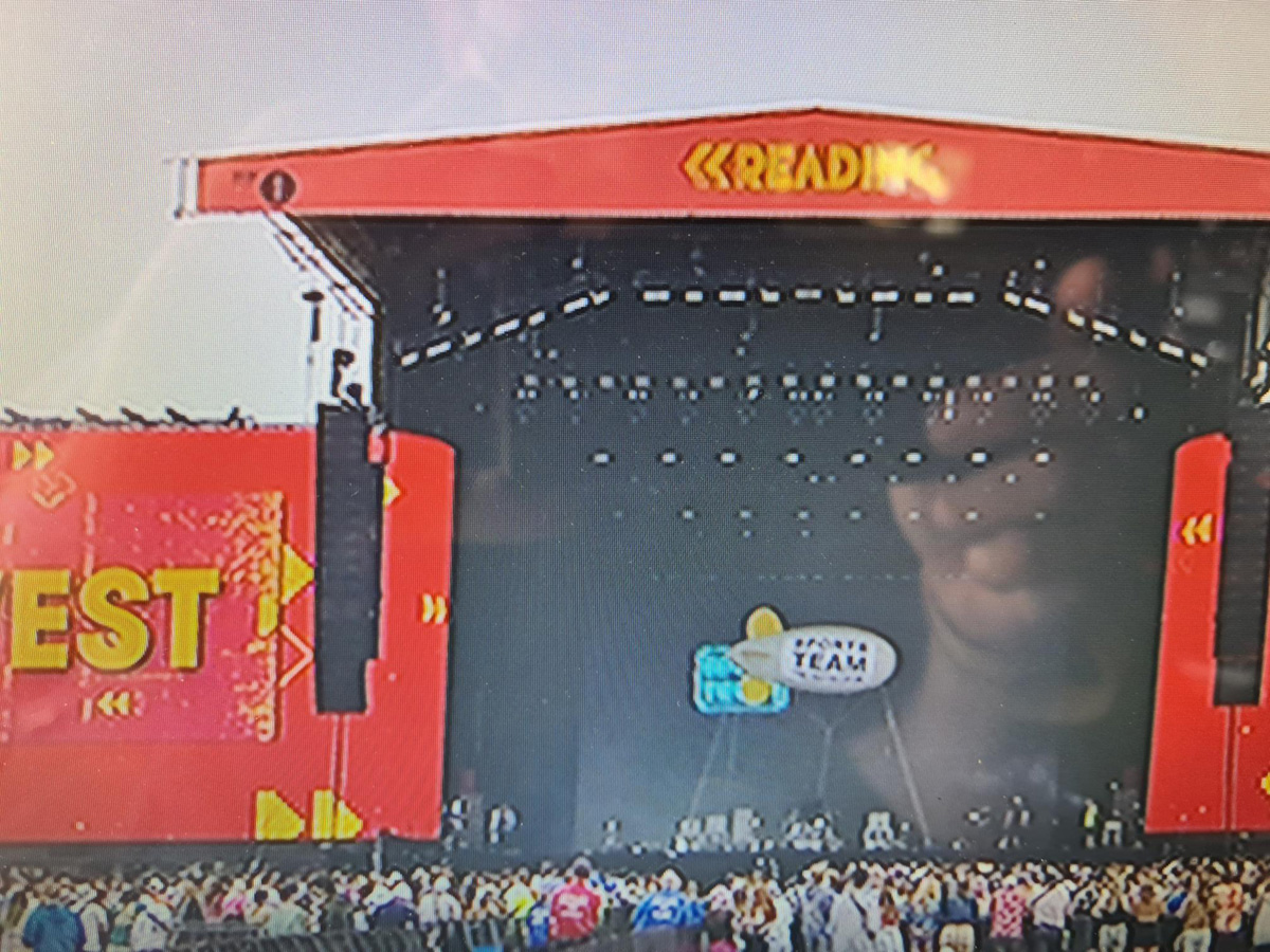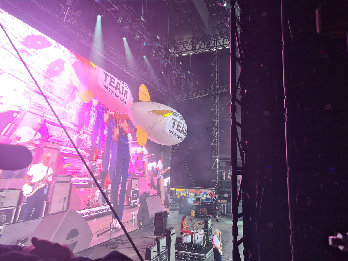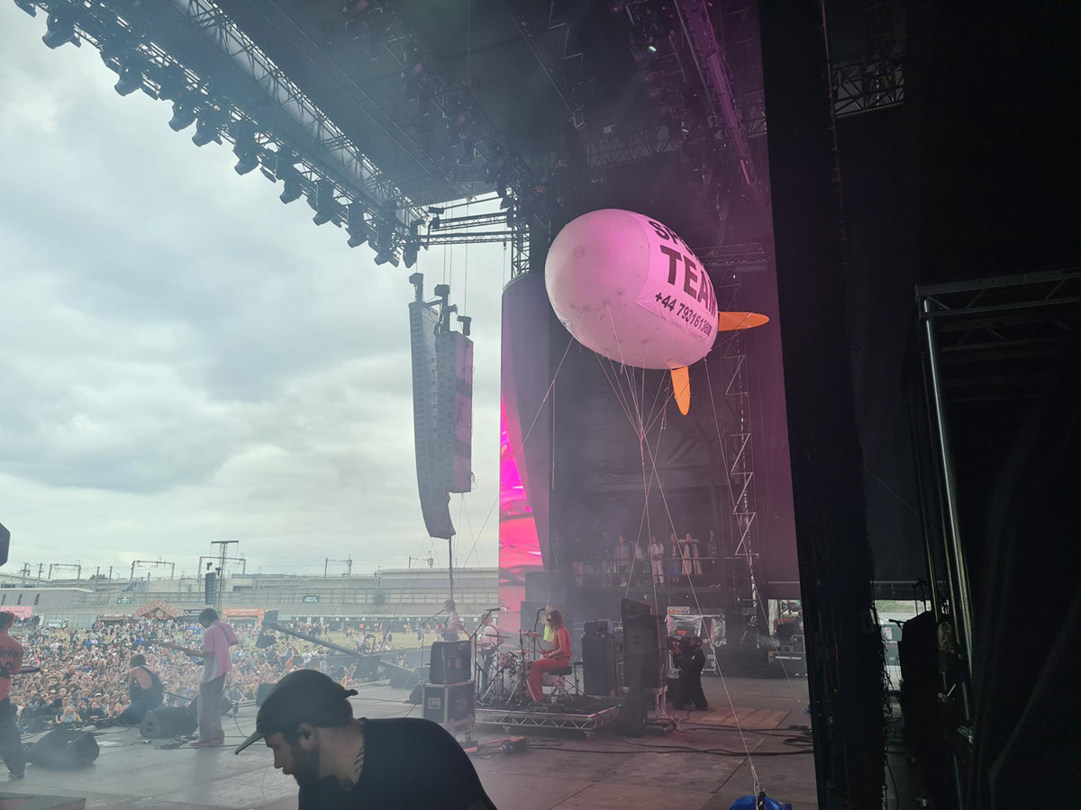 Our rental blimp has been put to good use on stage at Reading, to advertise the band SPORTS TEAM. A tricky installation requiring the blimp to fly inside the stage canopy without moving around too much to distract from the video backdrop or swooping towards the band!