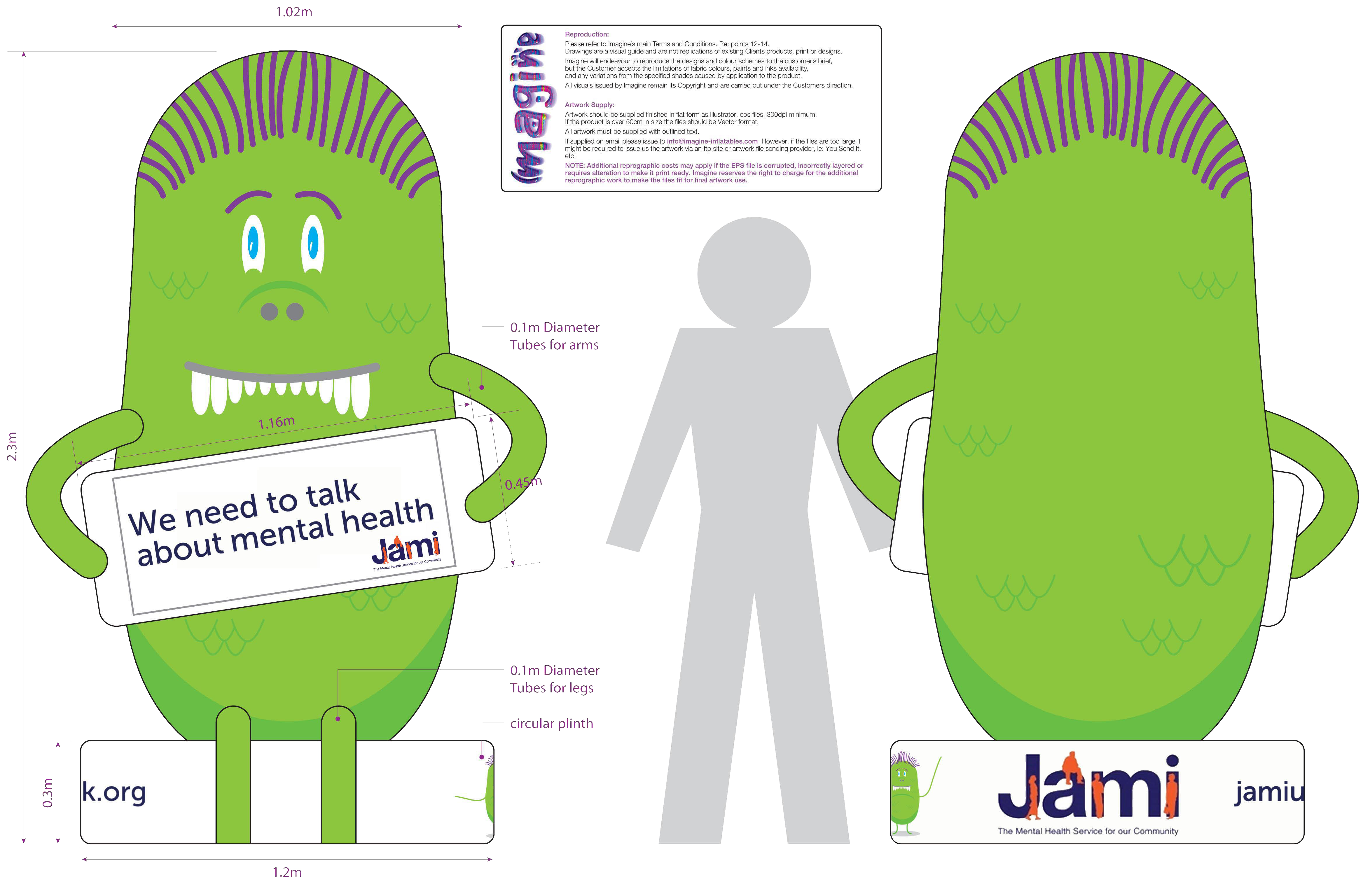 We have just completed manufacturing this Monster inflatable for mental health charity 'Jami'. They are using him to promote talking about mental health. We provided a full design service from a simple monster design which we then developed into a technical drawing suitable for production.
