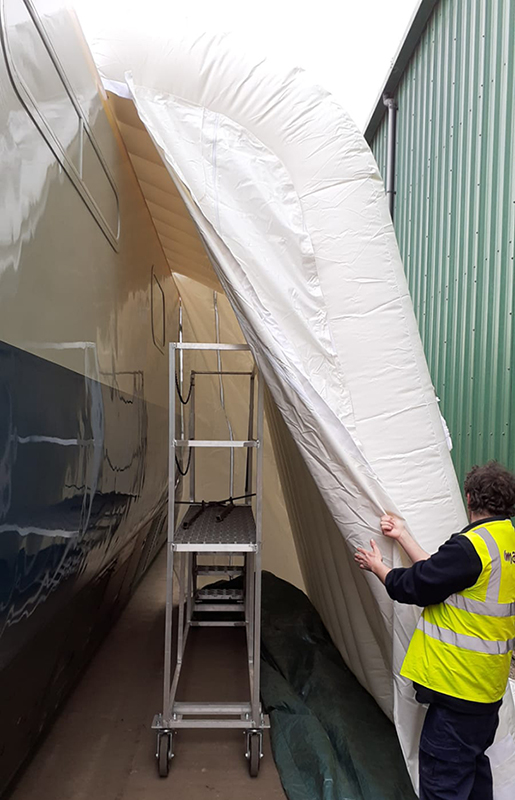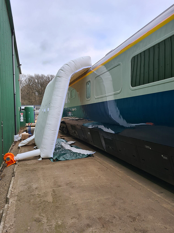 Our solution is an inflatable tarpaulin shelter which can be quickly velcro’ed to the train and the platform. An air filtration tube extracts fumes to an extraction unit outside the booth. The doors each end are removable.