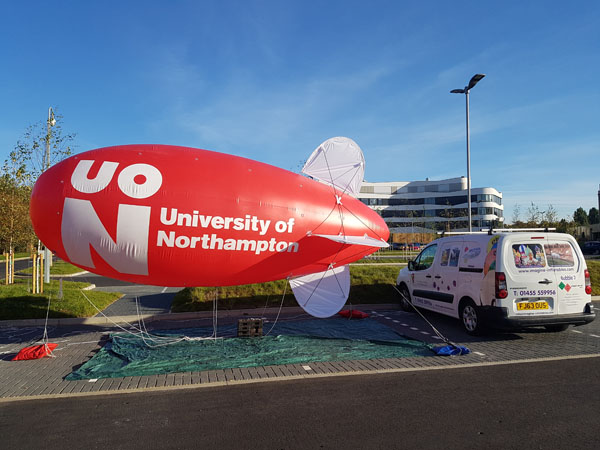 Some customers, like the University of Northampton purchase a blimp for advertising and special events and we store the inflatable at Imagine and then manage a series of scheduled fly dates that often coincide with open days. This is the University blimp ready for lift off at the most recent open day and we look forward to the next fly date!