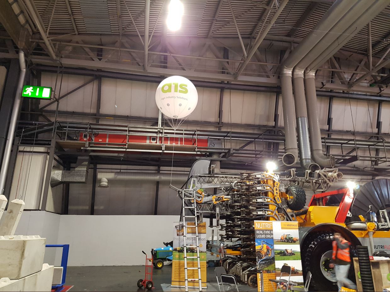 It's always good to hear back from old customers, especially if we can assist them in a spot of bother. Agri Industry Services needed us to attend to inflate and install a sphere we did for them last year at the NEC so we got over their promptly and got it into a precarious, but effective position to attract attention.