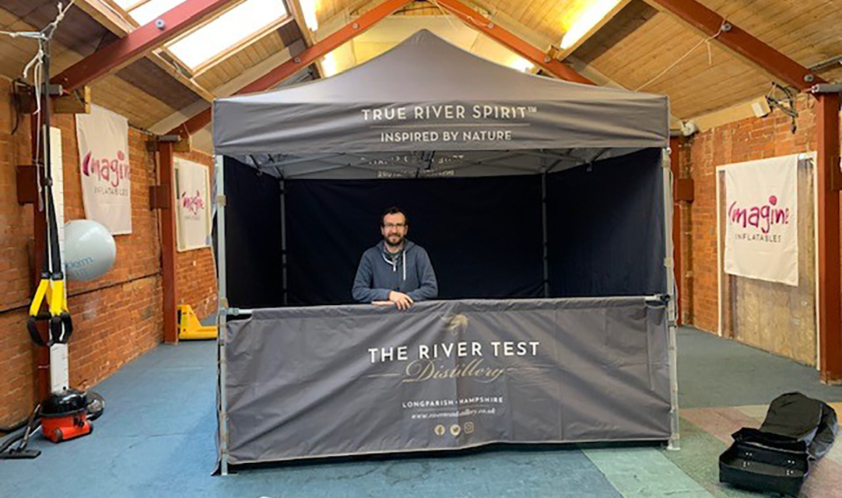 The River Test Distillery wanted a sleek and smart looking 3m gazebo in the colours of their company livery, so that the whole “look” of their delivery vans, aprons and advertising is seamless. The pantone matched double skin walls provide excellent wind shelter and weight for outdoor events, and the half wall frontage works as an ideal serving station. Print can be applied to the roof, valance/trim, and walls inside and out. A wheeled carry bag for the frame allows you to transport it fairly easily.